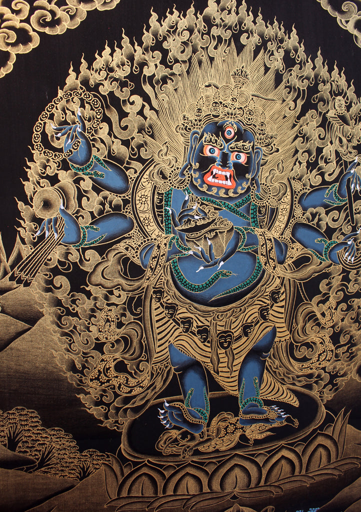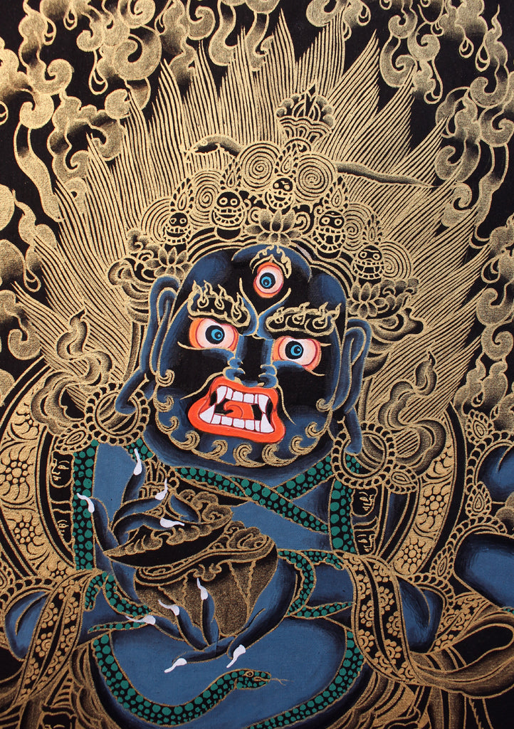 Mahākāla also appears as a protector deity known as a dharmapala in Vajrayana Buddhism. Mahākāla is typically black in color. Just as all colors are absorbed and dissolved into black, all names and forms are said to melt into those of Mahakala, symbolizing his all-embracing, comprehensive nature. Black can also represent the total absence of color, and again in this case it signifies the nature of Mahakala as ultimate or absolute reality. This principle is known in Sanskrit as ‘nirguna’, beyond all quality and form, and it is typified by both interpretations.