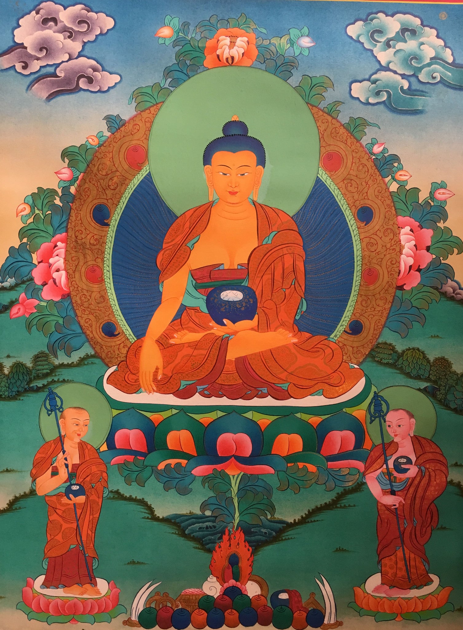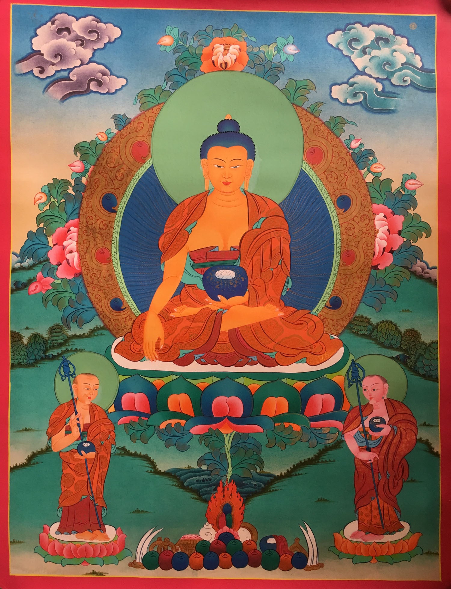 This is a majestic thangka of Shakyamuni Buddha surrounded by the eternal nature. The artist has depicted Shakyamuni in glowing orange while the nature around him is depicted in lush green.