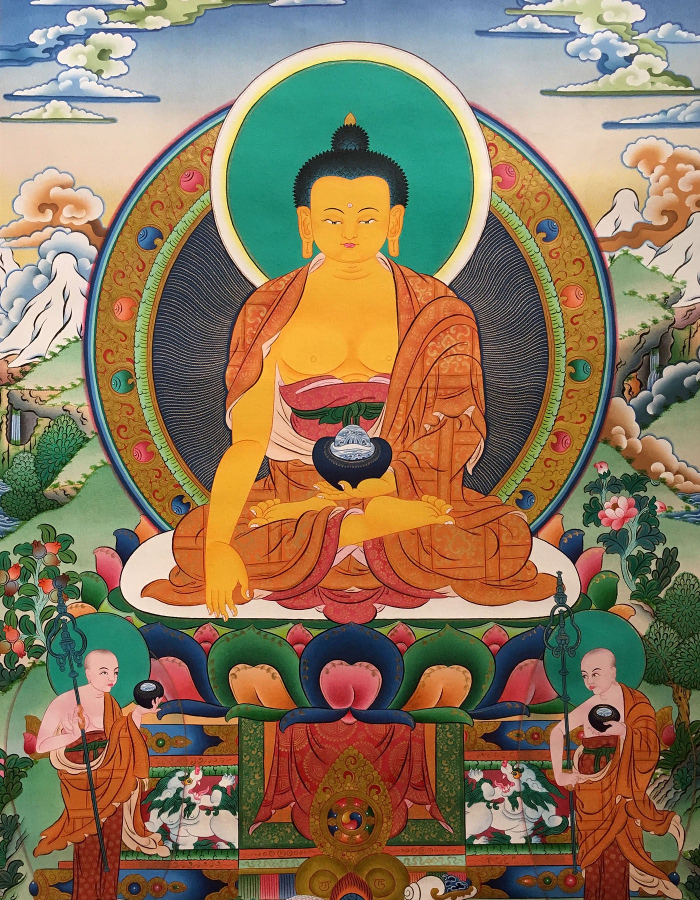 This meticulously hand painted thangka depicts Shakyamuni Buddha sitting on a lotus platform upon a singhashan(Lion Throne). The vibrant color and intricate brush strokes in this thangka are the main highlight. The artist has used his superb painting skills on this thangka to perfection.