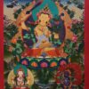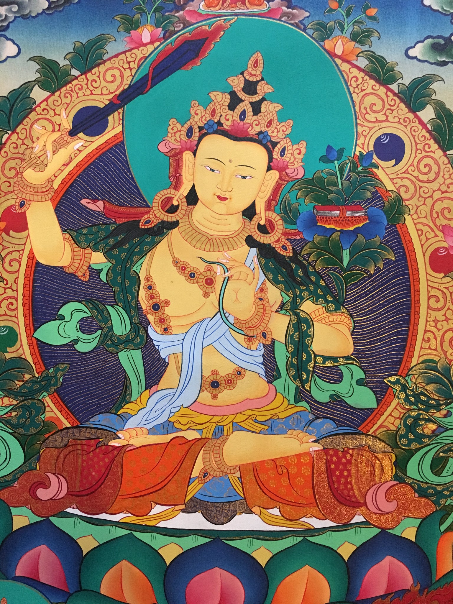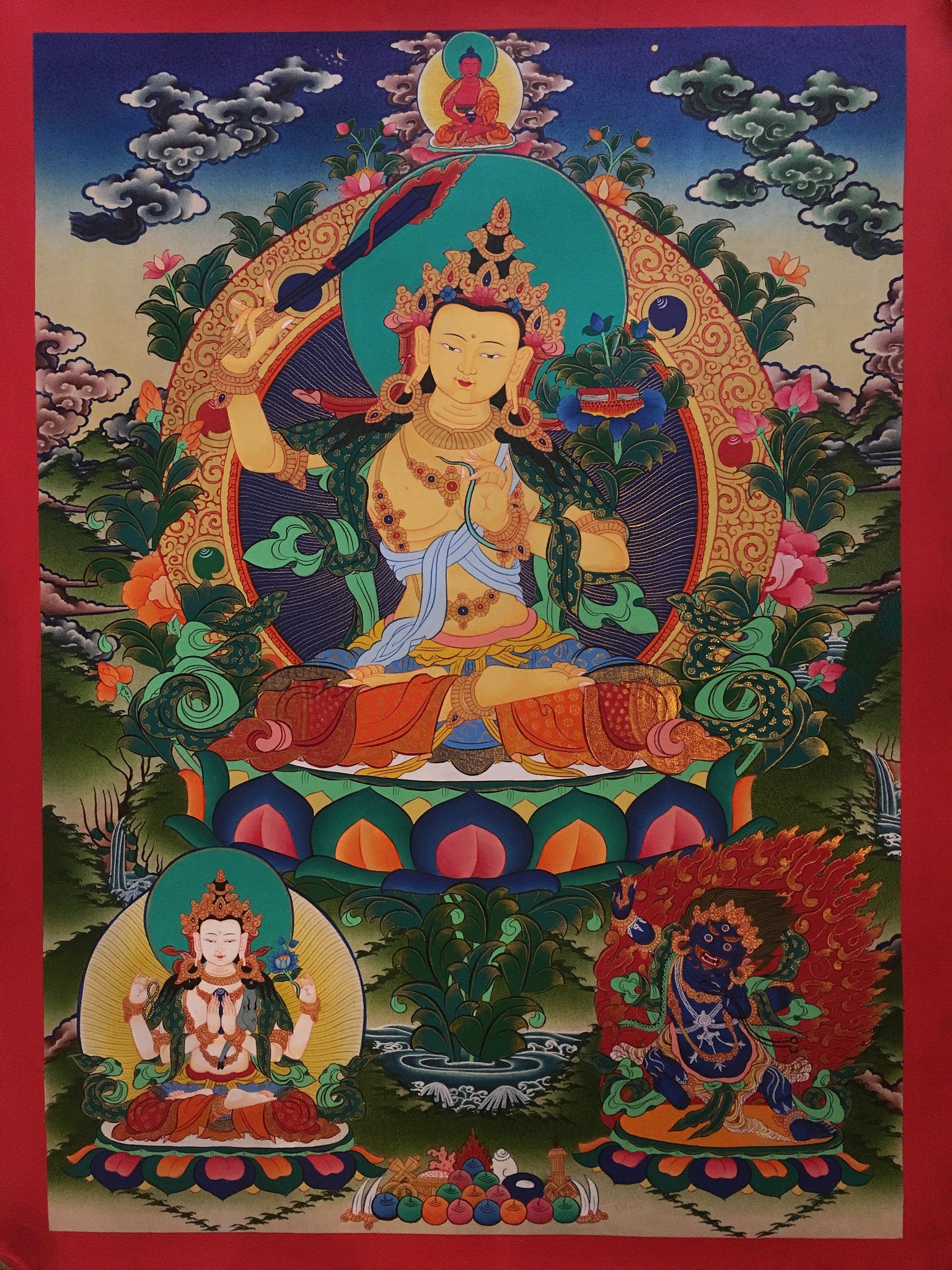 This Tibetan thangka depicts Manjushri, the central figure of Wisdom with the luscious surrounding glorified by Amitabha Buddha at the top along with Chenrezig and Vajrapani at the bottom corners.