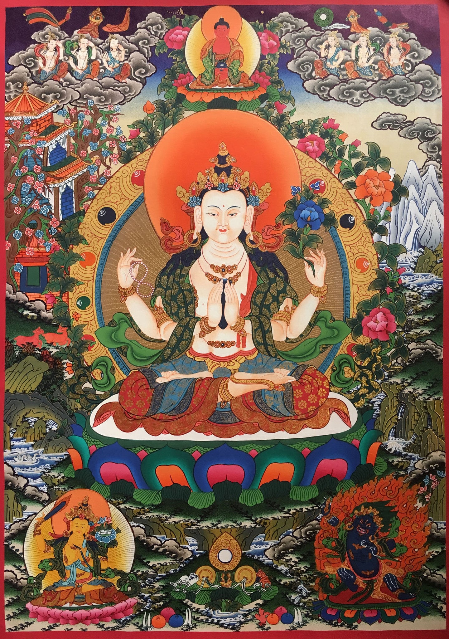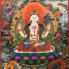 This is a finely detailed thangka of Chenrezig. The details on the drawing is very fine and precise. Many elements have been highlighted on this thangka. Amitabha Buddha is painted at the top whereas Manjushri and vajrapani are painted at the bottom corners.