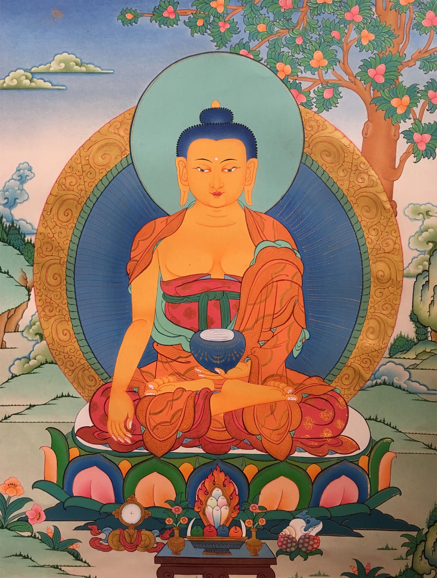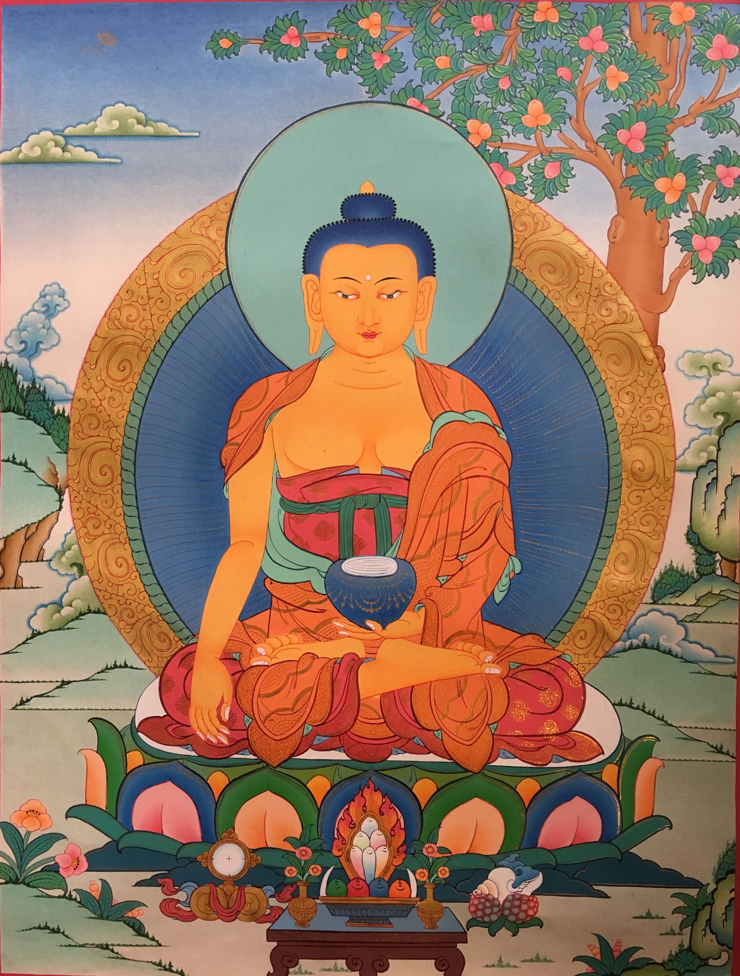Drawn on a primed cotton canvas, this thangka depicts Shakyamuni Buddha in a bhumisparsa mudra in a meditative pose. The color combination of this thangka is magnificent symbolizing the peaceful teachings of Buddha.