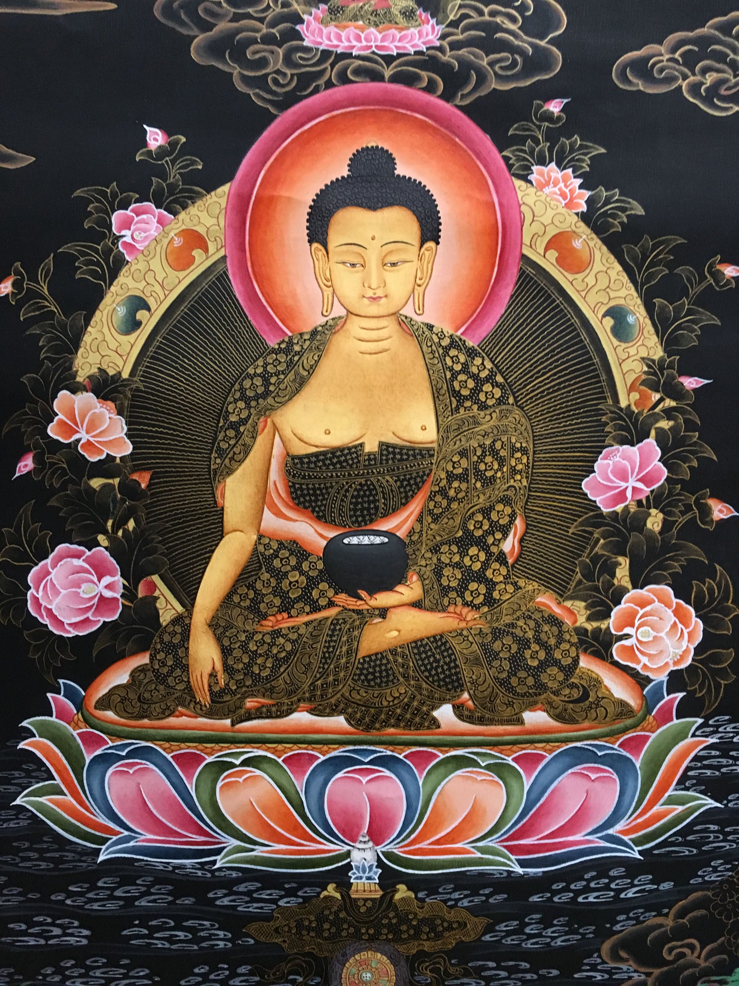 This is a dark thangka painting of Shakyamuni Buddha who is seated on a lotus platform in a bhumisparsa mudra(earth touching pose). The painting consists of largely dark color to depict the night in the background. The Buddha, the lotus, and his halo are colorfully and brightly depicted to remind us the purity, clarity, peace and tranquil nature.