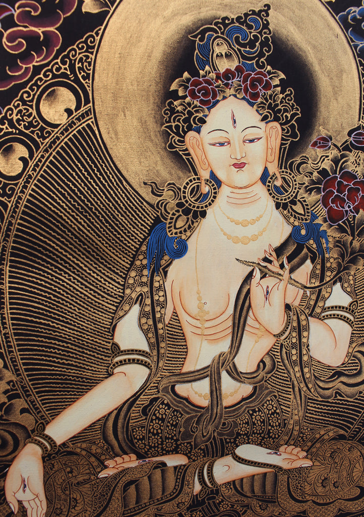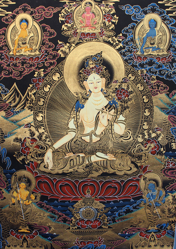 This is a hand drawn White Tara thangka painting with Pancha Buddha images. This is a great thangka painting with masterful brush strokes and fine details of the heavenly paradise of White Tara.